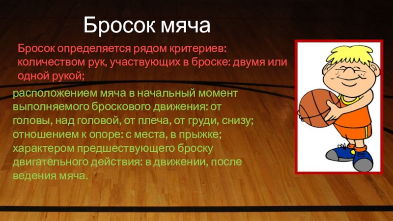 расположением мяча в начальный момент выполняемого броскового движения: от головы, над головой, от плеча, от груди, снизу;