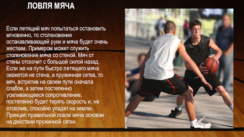 и мяча будет очень жестким. Примером может служить столкновение мяча со стеной. Мяч от стены отскочит с большой силой назад. Если же на пути быстро летящего мяча окажется не стена, а пружинная сетка, то мяч, встретив на своем пути сначала слабое, а затем постепенно усиливающееся сопротивление, постепенно будет терять скорость и, не отскочив, спокойно упадет на землю. Принцип правильной ловли мяча основан на действии пружинной сетки.