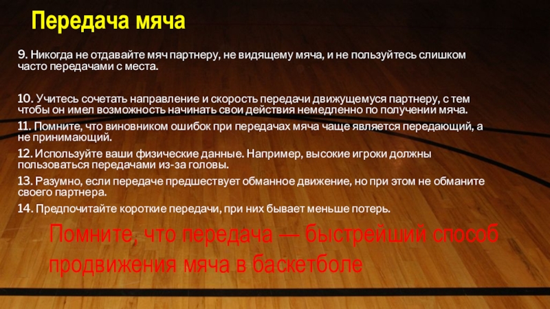 Помните, что передача — быстрейший способ продвижения мяча в баскетболе