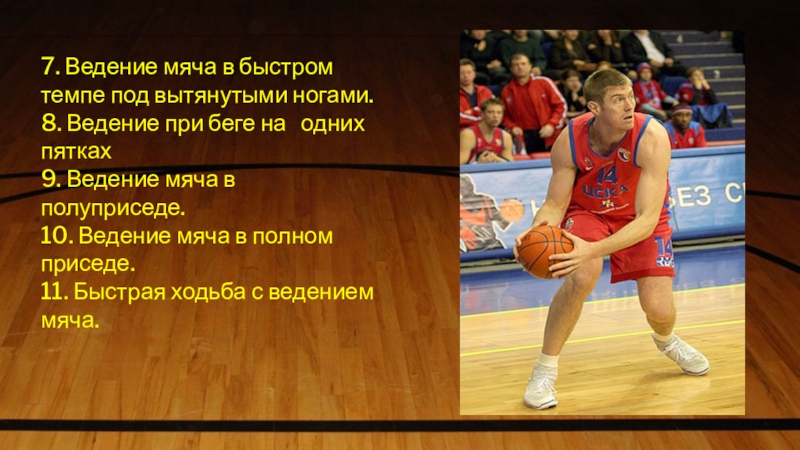 14. Быстро двигаясь вперед, выбрасывая прямые ноги вперед, с ведением баскетбольного мяча.