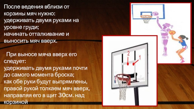 Слайд 29После ведения вблизи от корзины мяч нужно: