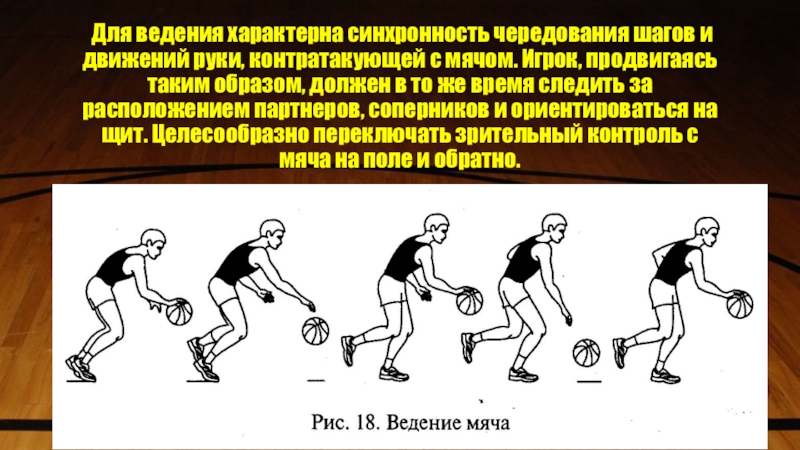 с мячом. Игрок, продвигаясь таким образом, должен в то же время следить за расположением партнеров, соперников и ориентироваться на щит. Целесообразно переключать зрительный контроль с мяча на поле и обратно.
