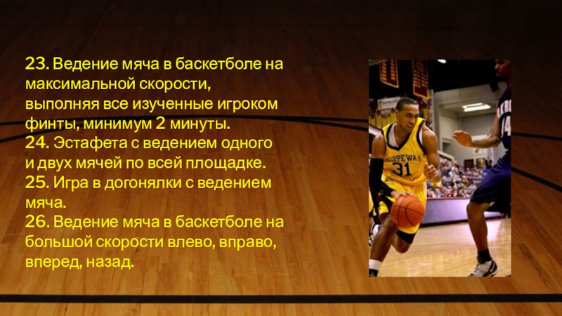 26. Ведение мяча в баскетболе на большой скорости влево, вправо, вперед, назад.