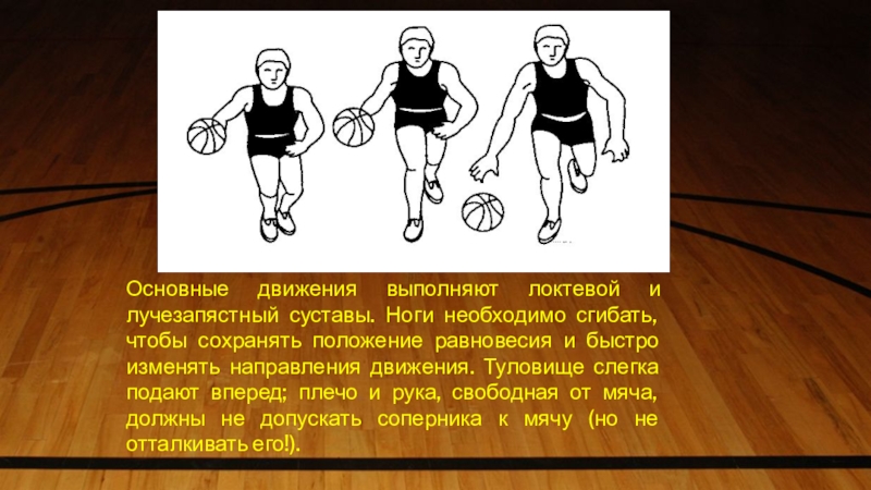 сохранять положение равновесия и быстро изменять направления движения. Туловище слегка подают вперед; плечо и рука, свободная от мяча, должны не допускать соперника к мячу (но не отталкивать его!).