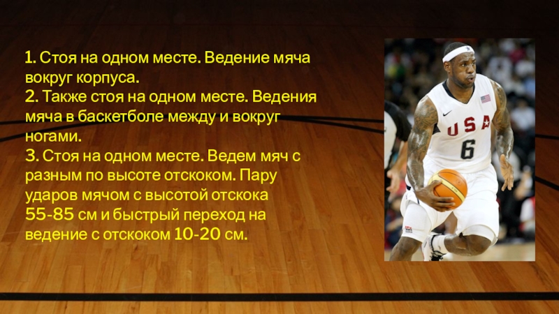 3. Стоя на одном месте. Ведем мяч с разным по высоте отскоком. Пару ударов мячом с высотой отскока 55-85 см и быстрый переход на ведение с отскоком 10-20 см.