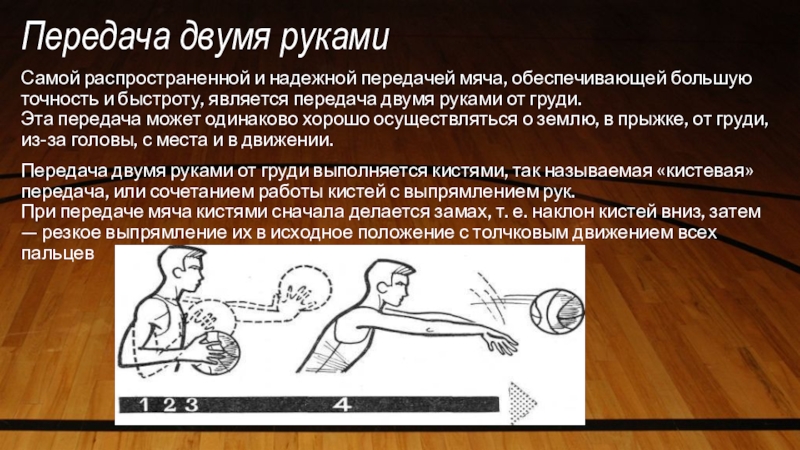 Передача двумя руками от груди выполняется кистями, так называемая «кистевая» передача, или сочетанием работы кистей с выпрямлением рук.
