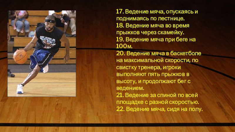 20. Ведение мяча в баскетболе на максимальной скорости, по свистку тренера, игроки выполняют пять прыжков в высоту, и продолжают бег с ведением.