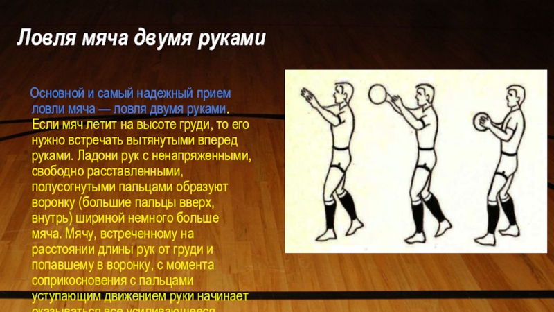 Для того чтобы правильно поймать мяч одной или двумя руками, нужно ясно представить себе весь процесс этого действия.