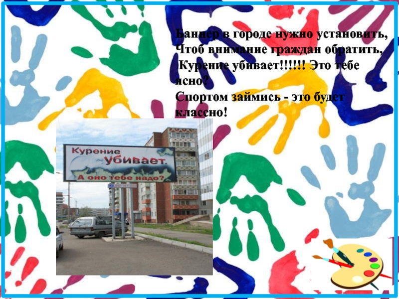 Баннер в городе нужно установить,Чтоб внимание граждан обратить, Курение убивает!!!!!! Это тебе ясно?Спортом займись - это