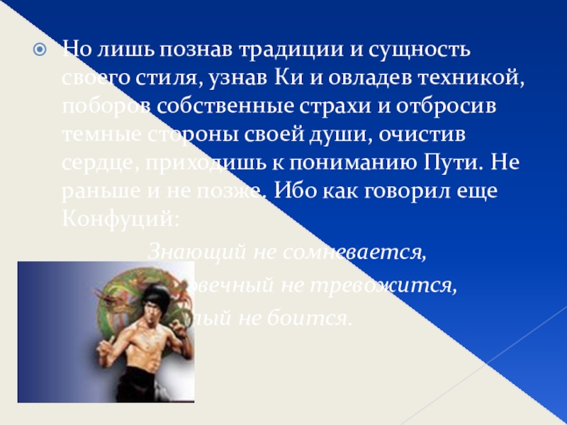 и овладев техникой, поборов собственные страхи и отбросив темные стороны своей души, очистив сердце, приходишь к пониманию Пути. Не раньше и не позже. Ибо как говорил еще Конфуций:
