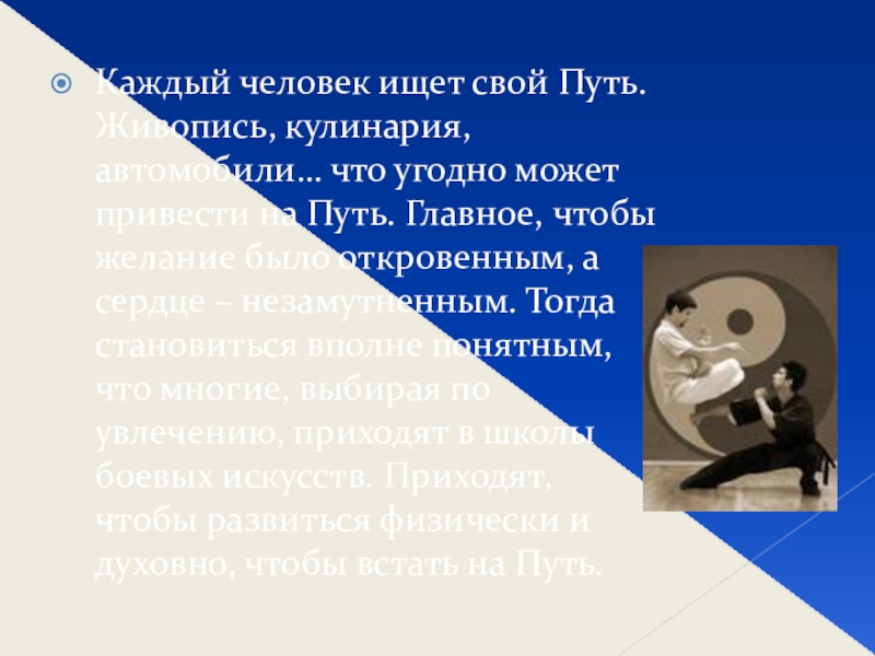 может привести на Путь. Главное, чтобы желание было откровенным, а сердце – незамутненным. Тогда становиться вполне понятным, что многие, выбирая по увлечению, приходят в школы боевых искусств. Приходят, чтобы развиться физически и духовно, чтобы встать на Путь.