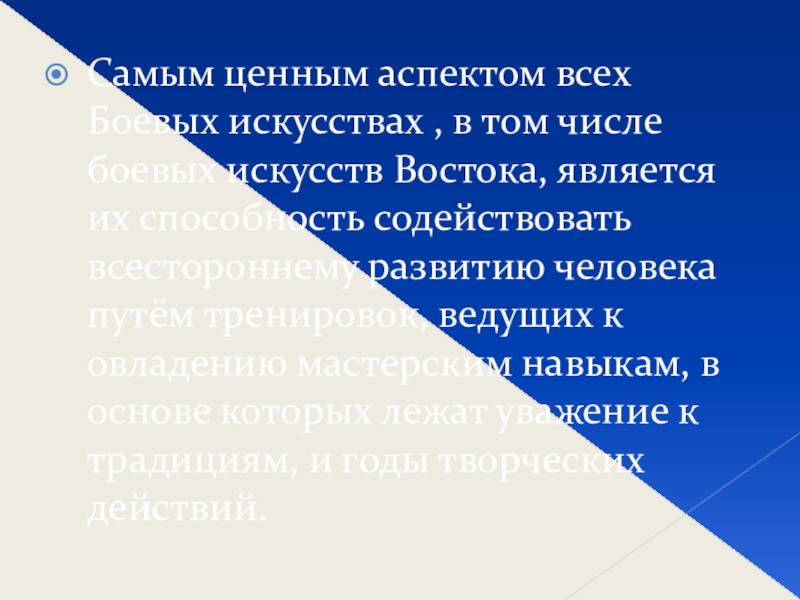 боевых искусств Востока, является их способность содействовать всестороннему развитию человека путём тренировок, ведущих к овладению мастерским навыкам, в основе которых лежат уважение к традициям, и годы творческих действий.