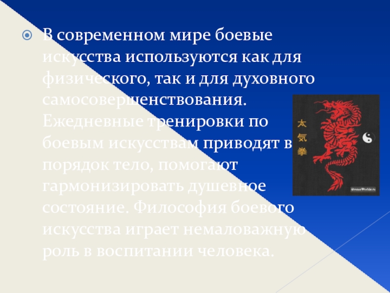и для духовного самосовершенствования. Ежедневные тренировки по боевым искусствам приводят в порядок тело, помогают гармонизировать душевное состояние. Философия боевого искусства играет немаловажную роль в воспитании человека.