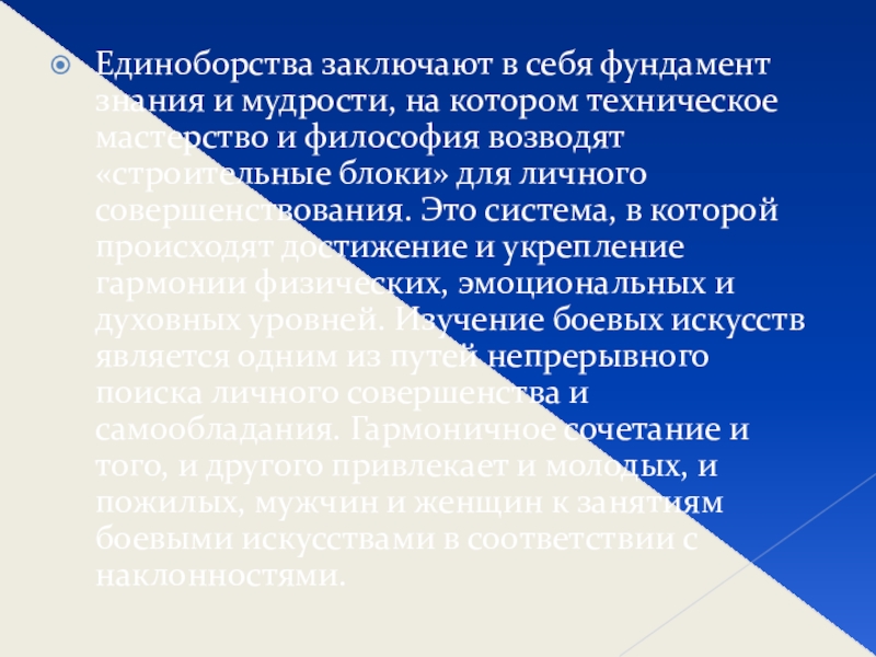техническое мастерство и философия возводят «строительные блоки» для личного совершенствования. Это система, в которой происходят достижение и укрепление гармонии физических, эмоциональных и духовных уровней. Изучение боевых искусств является одним из путей непрерывного поиска личного совершенства и самообладания. Гармоничное сочетание и того, и другого привлекает и молодых, и пожилых, мужчин и женщин к занятиям боевыми искусствами в соответствии с наклонностями.