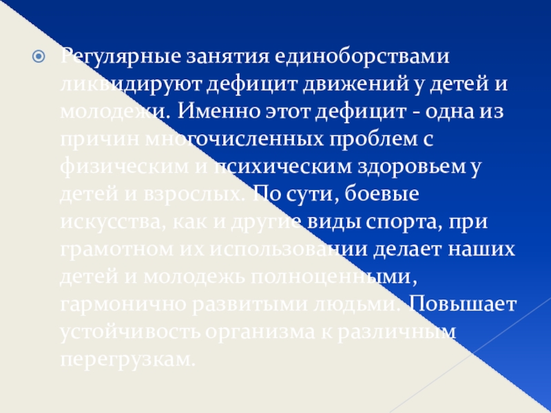 Именно этот дефицит - одна из причин многочисленных проблем с физическим и психическим здоровьем у детей и взрослых. По сути, боевые искусства, как и другие виды спорта, при грамотном их использовании делает наших детей и молодежь полноценными, гармонично развитыми людьми. Повышает устойчивость организма к различным перегрузкам.