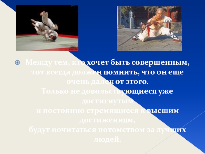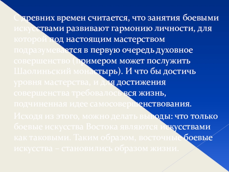 личности, для которой под настоящим мастерством подразумевается в первую очередь духовное совершенство (примером может послужить Шаолиньский монастырь). И что бы достичь уровня мастерства, и для достижения совершенства требовалось вся жизнь, подчиненная идее самосовершенствования.