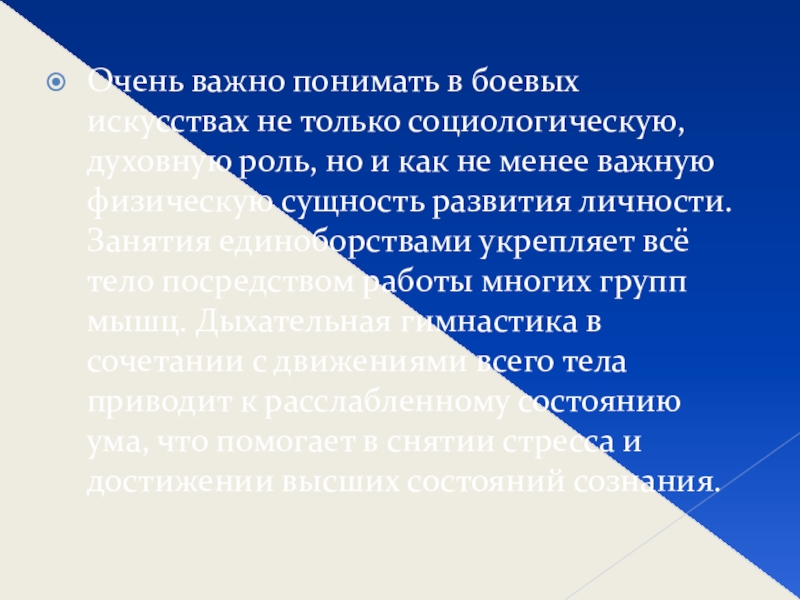 роль, но и как не менее важную физическую сущность развития личности. Занятия единоборствами укрепляет всё тело посредством работы многих групп мышц. Дыхательная гимнастика в сочетании с движениями всего тела приводит к расслабленному состоянию ума, что помогает в снятии стресса и достижении высших состояний сознания.