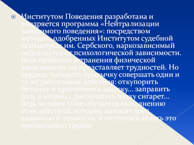 методик, одобренных Институтом судебной психиатрии им. Сербского, наркозависимый избавляется от психологической зависимости. Ведь проблема устранения физической зависимости, не представляет трудностей. Но труднее побороть привычку совершать одни и те же ритуальные действия: откупорить бутылку и приготовить закуску... заправить дозу в шприц... распечатать пачку сигарет... Ведь человек тоже обучается выполнению этих действий, которые наносят вред здоровью и личности, и отучиться делать это чрезвычайно трудно.
