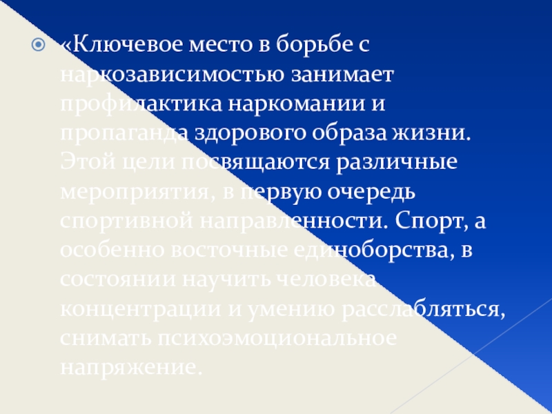 пропаганда здорового образа жизни. Этой цели посвящаются различные мероприятия, в первую очередь спортивной направленности. Спорт, а особенно восточные единоборства, в состоянии научить человека концентрации и умению расслабляться, снимать психоэмоциональное напряжение.