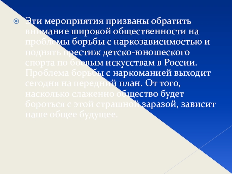 с наркозависимостью и поднять престиж детско-юношеского спорта по боевым искусствам в России. Проблема борьбы с наркоманией выходит сегодня на передний план. От того, насколько слаженно общество будет бороться с этой страшной заразой, зависит наше общее будущее.