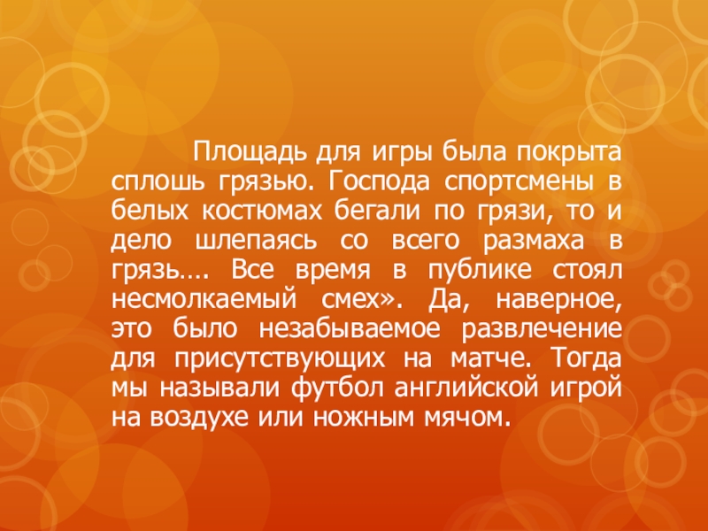сплошь грязью. Господа спортсмены в белых костюмах бегали по грязи, то и дело шлепаясь со всего размаха в грязь…. Все время в публике стоял несмолкаемый смех». Да, наверное, это было незабываемое развлечение для присутствующих на матче. Тогда мы называли футбол английской игрой на воздухе или ножным мячом.