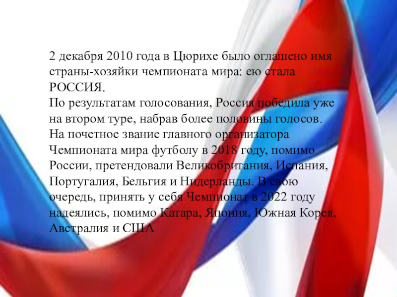 2 декабря 2010 года в Цюрихе было оглашено имя страны-хозяйки чемпионата мира: ею стала РОССИЯ.По результатам голосования,
