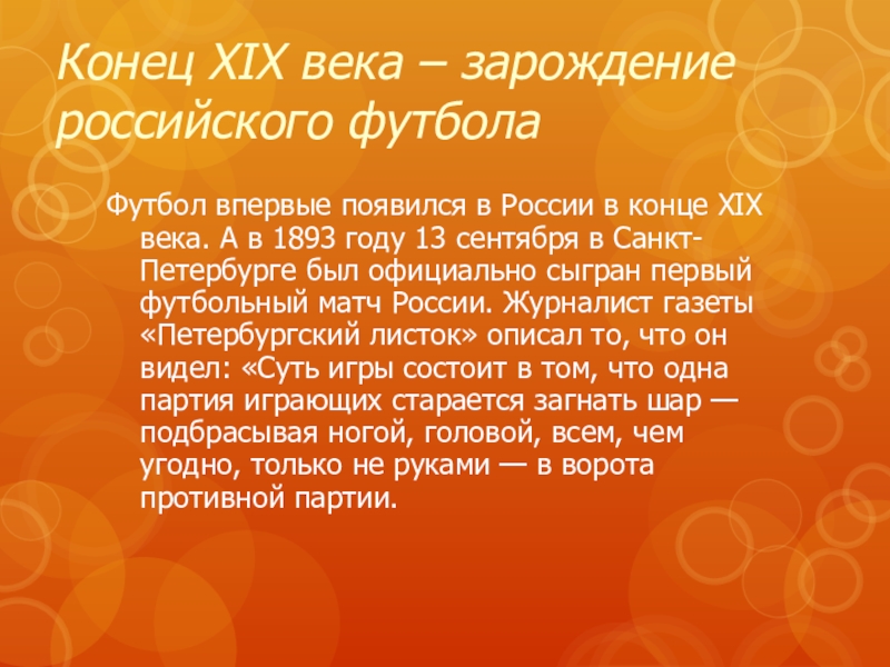 России в конце XIX века. А в 1893 году 13 сентября в Санкт-Петербурге был официально сыгран первый футбольный матч России. Журналист газеты «Петербургский листок» описал то, что он видел: «Суть игры состоит в том, что одна партия играющих старается загнать шар — подбрасывая ногой, головой, всем, чем угодно, только не руками — в ворота противной партии.