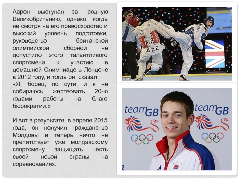Слайд 15Аарон выступал за родную Великобританию, однако, когда не смотря на его