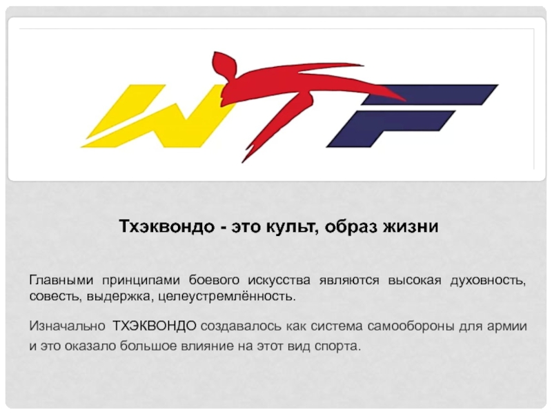 Изначально ТХЭКВОНДО создавалось как система самообороны для армии и это оказало большое влияние на этот вид спорта.