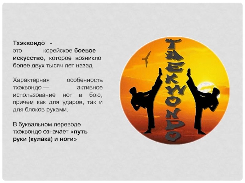 В буквальном переводе тхэквондо означает «путь руки (кулака) и ноги»
