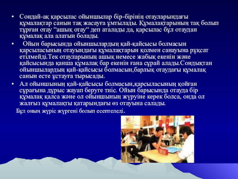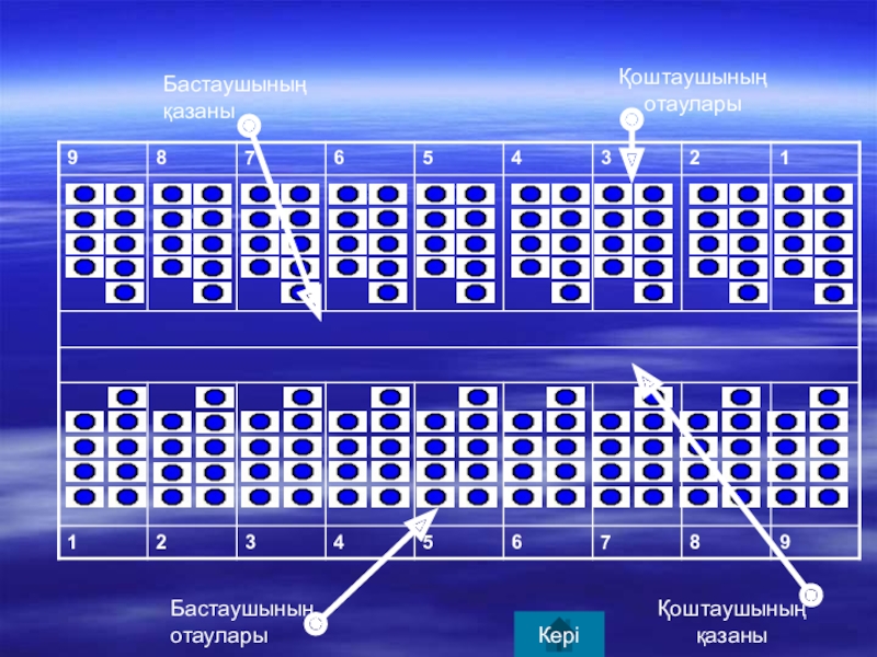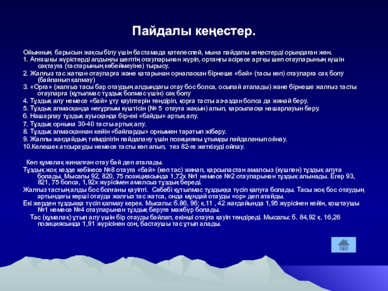 1. Алғашқы жүрістерді алдыңғы шептің отауларынан жүріп, ортаңғы әсіресе артқы шеп отауларының күшін сақтауға (тастарының көбеймеуіне) тырысу.