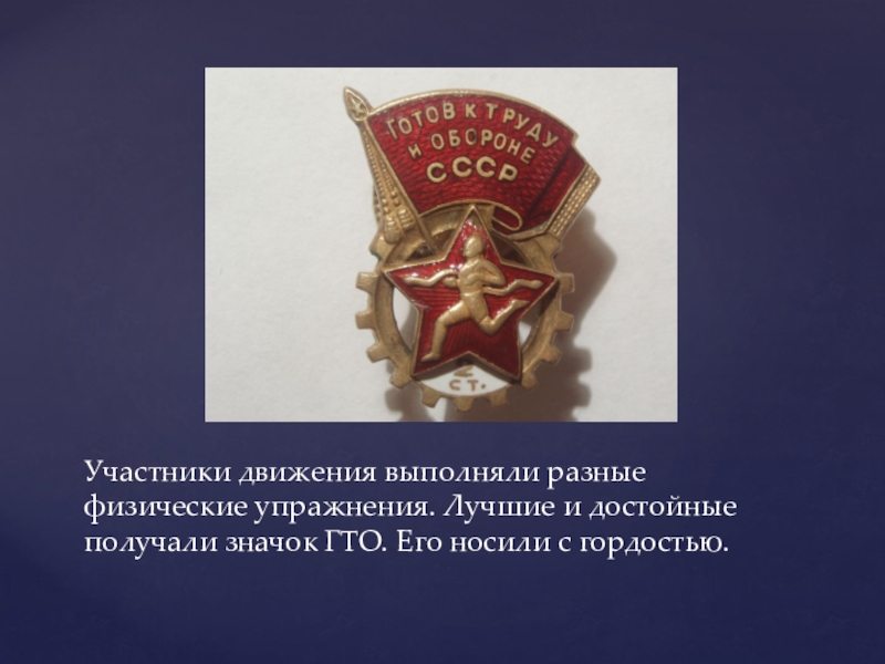 Участники движения выполняли разные физические упражнения. Лучшие и достойные получали значок ГТО. Его носили с гордостью.