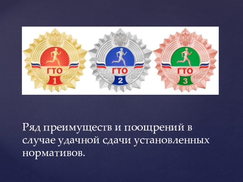 Слайд 14Ряд преимуществ и поощрений в случае удачной сдачи установленных нормативов.