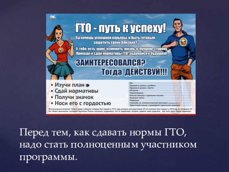 Слайд 28Перед тем, как сдавать нормы ГТО, надо стать полноценным участником программы.
