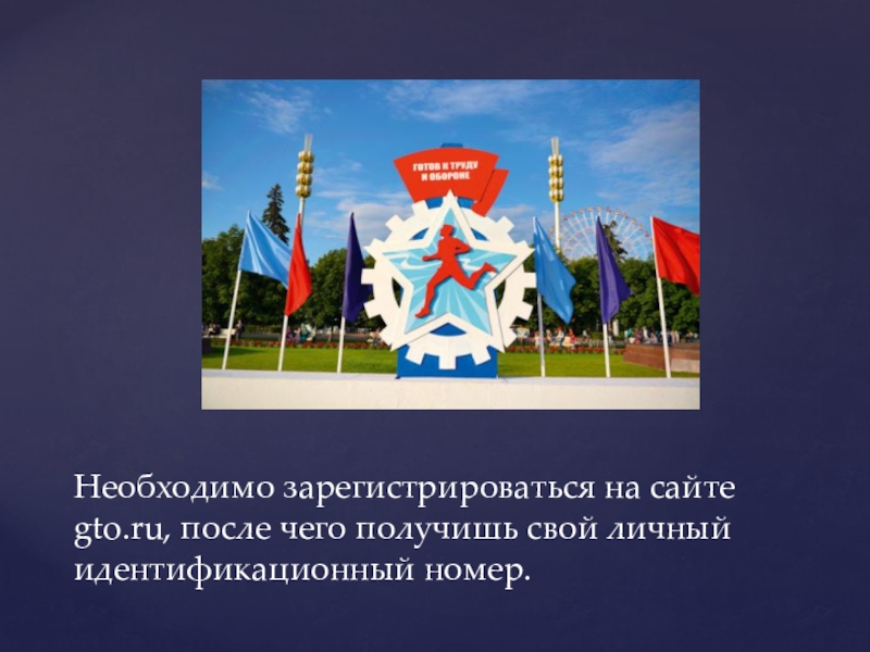 Слайд 29Необходимо зарегистрироваться на сайте gto.ru, после чего получишь свой личный идентификационный