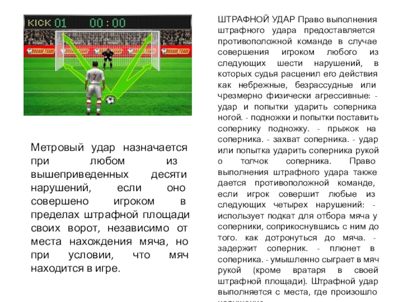 Метровый удар назначается при любом из вышеприведенных десяти нарушений, если оно совершено игроком в пределах штрафной площади своих ворот, независимо от места нахождения мяча, но при условии, что мяч находится в игре.