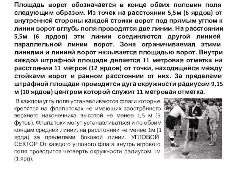 В каждом углу поля устанавливаются флаги которые крепятся на флагштоках не имеющих заострённого верхнего наконечника высотой не менее 1,5 м (5 футов). Флагштоки могут устанавливаться и по обоим концам средней линии, на расстоянии не менее 1м (1 ярда) за пределами боковой линии. УГЛОВОЙ СЕКТОР От каждого углового флага внутрь игрового поля проводится четверть окружности радиусом 1м (1 ярд).