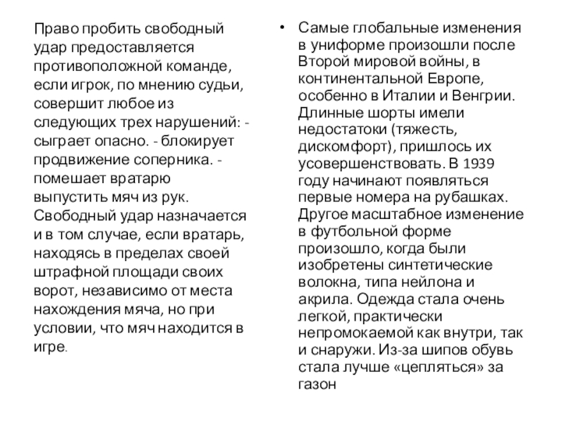 Право пробить свободный удар предоставляется противоположной команде, если игрок, по мнению судьи, совершит любое из следующих трех нарушений: - сыграет опасно. - блокирует продвижение соперника. - помешает вратарю выпустить мяч из рук. Свободный удар назначается и в том случае, если вратарь, находясь в пределах своей штрафной площади своих ворот, независимо от места нахождения мяча, но при условии, что мяч находится в игре.