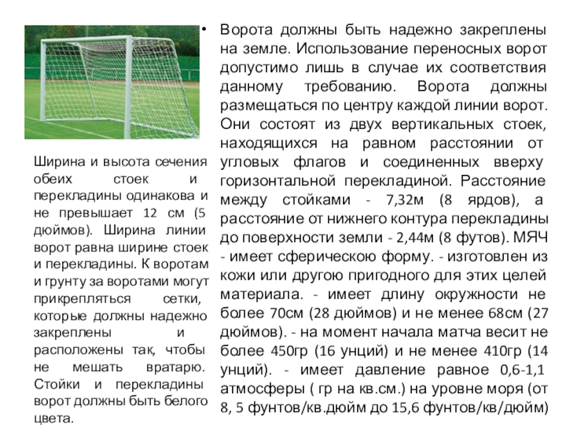 Ширина и высота сечения обеих стоек и перекладины одинакова и не превышает 12 см (5 дюймов). Ширина линии ворот равна ширине стоек и перекладины. К воротам и грунту за воротами могут прикрепляться сетки, которые должны надежно закреплены и расположены так, чтобы не мешать вратарю. Стойки и перекладины ворот должны быть белого цвета.