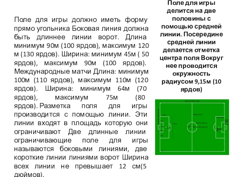Поле для игры должно иметь форму прямо угольника Боковая линия должна быть длиннее линии ворот. Длина минимум 90м (100 ярдов), максимум 120 м (130 ярдов). Ширина: минимум 45м ( 50 ярдов), максимум 90м (100 ярдов). Международные матчи Длина: минимум 100м (110 ярдов), максимум 110м (120 ярдов). Ширина: минимум 64м (70 ярдов), максимум 75м (80 ярдов). Разметка поля для игры производится с помощью линии. Эти линии входят в площадь которую они ограничивают Две длинные линии ограничивающие поле для игры называются боковыми линиями, две короткие линии линиями ворот Ширина всех линии не превышает 12 см(5 дюймов).