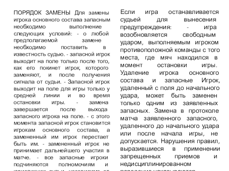 ПОРЯДОК ЗАМЕНЫ Для замены игрока основного состава запасным необходимо выполнение следующих условий: - о любой предполагаемой замене необходимо поставить в известность судью. - запасной игрок выходит на поле только после того, как его покинет игрок, которого заменяют, и после получения сигнала от судьи. - Запасной игрок выходит на поле для игры только у средней линии и во время остановки игры. - замена завершается после выхода запасного игрока на поле. - с этого момента запасной игрок становится игрокам основного состава, а замененный им игрок перестает быть им. - замененный игрок не принимает дальнейшего участия в матче. - все запасные игроки подчиняются полномочиям и юрисдикции судьи, независимо от того. принимают ли они участие в игре или нет
