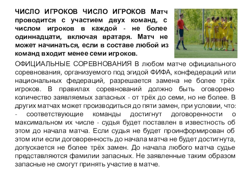 ОФИЦИАЛЬНЫЕ СОРЕВНОВАНИЯ В любом матче официального соревнования, организуемого под эгидой ФИФА, конфедераций или национальных федераций, разрешается замена не более трёх игроков. В правилах соревнований должно быть оговорено количество заявляемых запасных - от трёх до семи, но не более. В других матчах может производиться до пяти замен, при условии, что: - соответствующие команды достигнут договоренности о максимальном их числе - судья будет поставлен в известность об этом до начала матча. Если судья не будет проинформирован об этом или если договоренность до начала матча не будет достигнута, допускается не более трёх замен. До начала любого матча судье представляются фамилии запасных. Не заявленные таким образом запасные не смогут принять участие в матче.