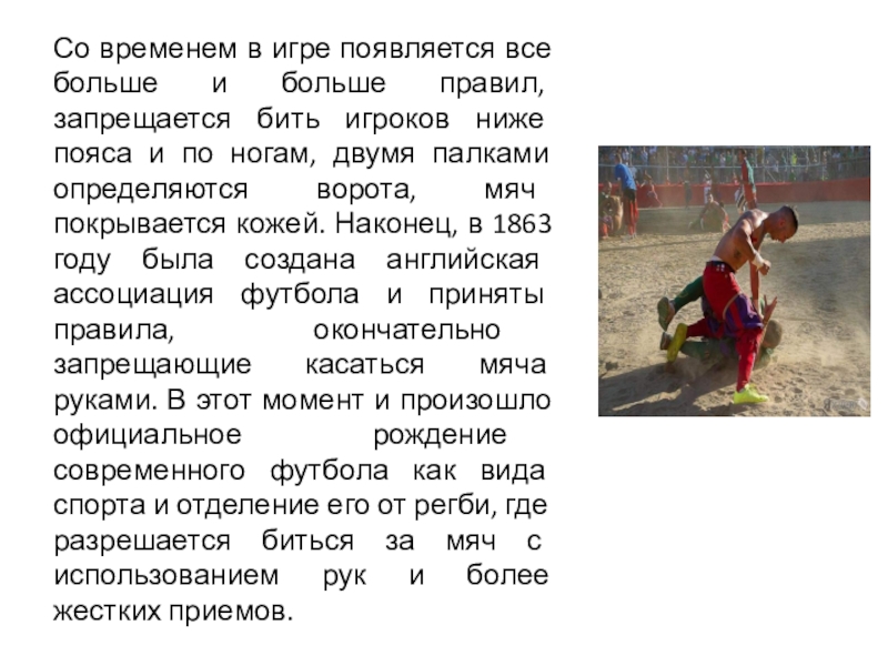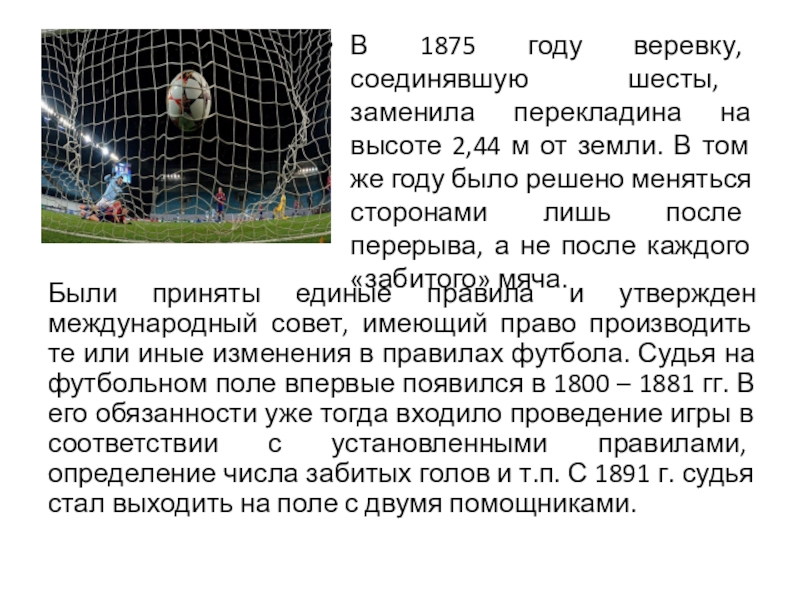 Были приняты единые правила и утвержден международный совет, имеющий право производить те или иные изменения в правилах футбола. Судья на футбольном поле впервые появился в 1800 – 1881 гг. В его обязанности уже тогда входило проведение игры в соответствии с установленными правилами, определение числа забитых голов и т.п. С 1891 г. судья стал выходить на поле с двумя помощниками.