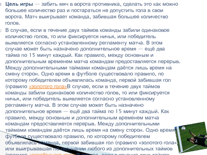 Слайд 5Цель игры — забить мяч в ворота противника, сделать это как можно