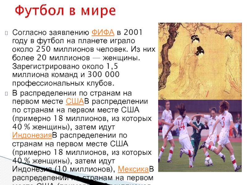 Слайд 6Согласно заявлению ФИФА в 2001 году в футбол на планете играло