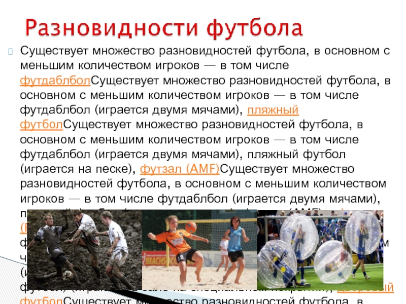 том числе футдаблболСуществует множество разновидностей футбола, в основном с меньшим количеством игроков — в том числе футдаблбол (играется двумя мячами), пляжный футболСуществует множество разновидностей футбола, в основном с меньшим количеством игроков — в том числе футдаблбол (играется двумя мячами), пляжный футбол (играется на песке), футзал (AMF)Существует множество разновидностей футбола, в основном с меньшим количеством игроков — в том числе футдаблбол (играется двумя мячами), пляжный футбол (играется на песке), футзал (AMF) и футзал (FIFA) (мини-футбол)Существует множество разновидностей футбола, в основном с меньшим количеством игроков — в том числе футдаблбол (играется двумя мячами), пляжный футбол (играется на песке), футзал (AMF) и футзал (FIFA) (мини-футбол) (играются в зале на специальном покрытии), дворовый футболСуществует множество разновидностей футбола, в основном с меньшим количеством игроков — в том числе футдаблбол (играется двумя мячами), пляжный футбол (играется на песке), футзал (AMF) и футзал (FIFA) (мини-футбол) (играются в зале на специальном покрытии), дворовый футбол (играется на любом покрытии на полях любого размера любым количеством людей), болотный футболСуществует множество разновидностей футбола, в основном с меньшим количеством игроков — в том числе футдаблбол (играется двумя мячами), пляжный футбол (играется на песке), футзал (AMF) и футзал (FIFA) (мини-футбол) (играются в зале на специальном покрытии), дворовый футбол (играется на любом покрытии на полях любого размера любым количеством людей), болотный футбол (играется на болоте), футбольный фристайл (заключается в исполнении всевозможных финтов и трюков).