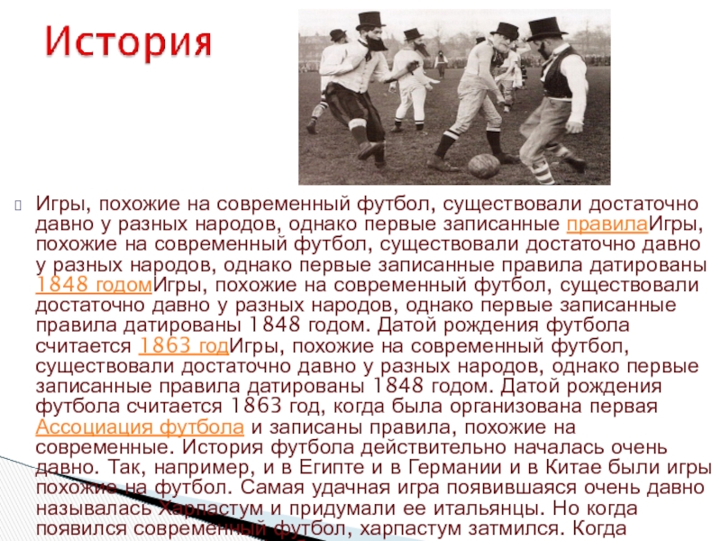 однако первые записанные правилаИгры, похожие на современный футбол, существовали достаточно давно у разных народов, однако первые записанные правила датированы 1848 годомИгры, похожие на современный футбол, существовали достаточно давно у разных народов, однако первые записанные правила датированы 1848 годом. Датой рождения футбола считается 1863 годИгры, похожие на современный футбол, существовали достаточно давно у разных народов, однако первые записанные правила датированы 1848 годом. Датой рождения футбола считается 1863 год, когда была организована первая Ассоциация футбола и записаны правила, похожие на современные. История футбола действительно началась очень давно. Так, например, и в Египте и в Германии и в Китае были игры похожие на футбол. Самая удачная игра появившаяся очень давно называлась Харпастум и придумали ее итальянцы. Но когда появился современный футбол, харпастум затмился. Когда англичане придумали футбол, они сразу стали распространять его во всех странах, включая Россию. Тогда в чемпионате было очень много английских команд. Из российских самая удачливая тогда команда была Питерский кружок рукоделия. О футболе в России впервые было сказано в книге «игры с мячом на воздухе» одного из докторов.