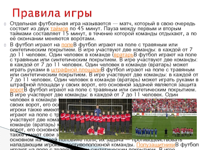 В футбол играют на полеВ футбол играют на поле с травяным или синтетическим покрытием. В игре участвуют две команды: в каждой от 7 до 11 человек. Один человек в команде (вратарьВ футбол играют на поле с травяным или синтетическим покрытием. В игре участвуют две команды: в каждой от 7 до 11 человек. Один человек в команде (вратарь) может играть руками в штрафной площадиВ футбол играют на поле с травяным или синтетическим покрытием. В игре участвуют две команды: в каждой от 7 до 11 человек. Один человек в команде (вратарь) может играть руками в штрафной площади у своих ворот, его основной задачей является защита воротВ футбол играют на поле с травяным или синтетическим покрытием. В игре участвуют две команды: в каждой от 7 до 11 человек. Один человек в команде (вратарь) может играть руками в штрафной площади у своих ворот, его основной задачей является защита ворот. Остальные игроки также имеют свои задачи и позиции на поле. ЗащитникиВ футбол играют на поле с травяным или синтетическим покрытием. В игре участвуют две команды: в каждой от 7 до 11 человек. Один человек в команде (вратарь) может играть руками в штрафной площади у своих ворот, его основной задачей является защита ворот. Остальные игроки также имеют свои задачи и позиции на поле. Защитники располагаются в основном на своей половине поля, их задача — противодействовать нападающим игрокам противоположной команды. ПолузащитникиВ футбол играют на поле с травяным или синтетическим покрытием. В игре участвуют две команды: в каждой от 7 до 11 человек. Один человек в команде (вратарь) может играть руками в штрафной площади у своих ворот, его основной задачей является защита ворот. Остальные игроки также имеют свои задачи и позиции на поле. Защитники располагаются в основном на своей половине поля, их задача — противодействовать нападающим игрокам противоположной команды. Полузащитники действуют в середине поля, их роль — помогать защитникам или нападающим в зависимости от игровой ситуации. НападающиеВ футбол играют на поле с травяным или синтетическим покрытием. В игре участвуют две команды: в каждой от 7 до 11 человек. Один человек в команде (вратарь) может играть руками в штрафной площади у своих ворот, его основной задачей является защита ворот. Остальные игроки также имеют свои задачи и позиции на поле. Защитники располагаются в основном на своей половине поля, их задача — противодействовать нападающим игрокам противоположной команды. Полузащитники действуют в середине поля, их роль — помогать защитникам или нападающим в зависимости от игровой ситуации. Нападающие располагаются, преимущественно на половине поля соперника, основная задача — забивать голы.