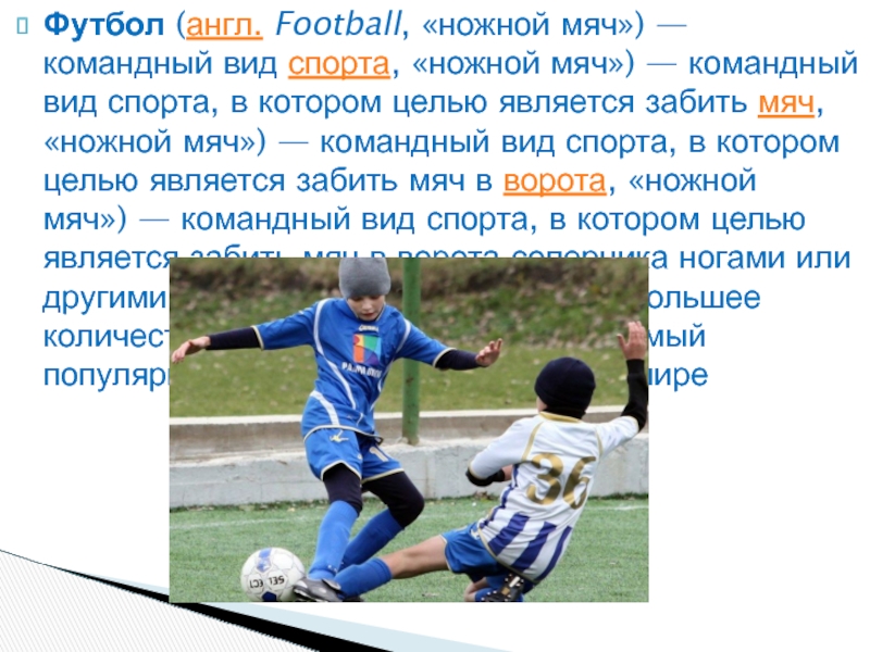 Слайд 2Футбол (англ. Football, «ножной мяч») — командный вид спорта, «ножной мяч») — командный