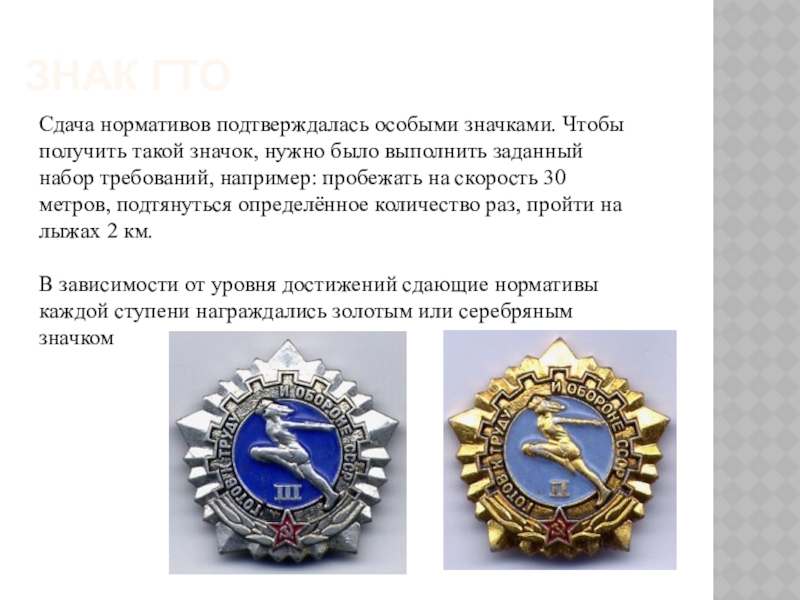 Сдача нормативов подтверждалась особыми значками. Чтобы получить такой значок, нужно